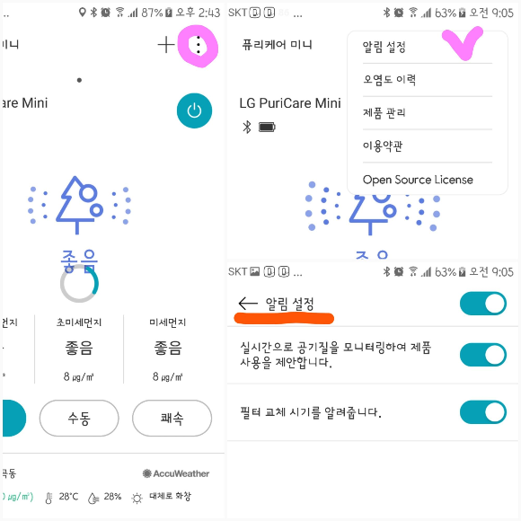 앱 화면의 오른쪽 윗부분 점3개 있는 부분(아래 그림 동그라미)을 눌러주면 알림설정/오염도이력/제품관리 항목이 나타납니다.