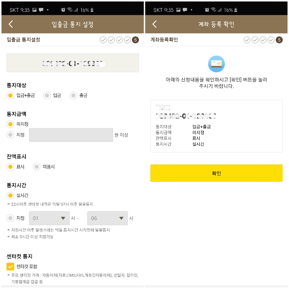 마지막 5단계. 입출금 통지에 관한 여러 항목을 설정하는 단계입니다.
