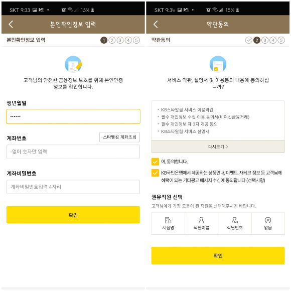 2단계는 서비스 이용 약관 동의입니다. 뭐 대충 다 동의해줍니다. 권유직원은 모르기 때문에 없음으로 선택하고 확인을 눌러줍니다.